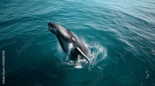 © aimodels24, Fototapeta premium Gigantic humpback whale breaching the surface of the blue waters near a beach