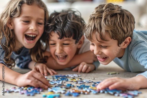 Fototapeta premium Giggling Children Assembling a Puzzle Together – Happy Childhood Moments and Playtime Fun
