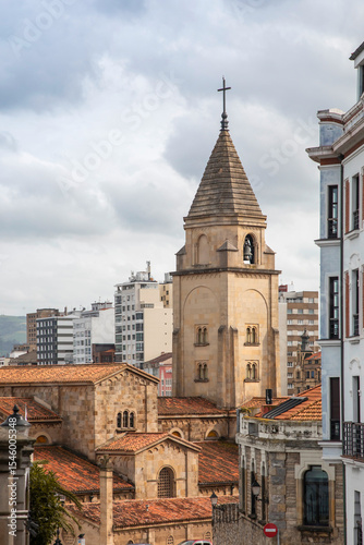 Fototapeta premium Gijon city view, Historic church tower in an urban cityscape under a cloudy...