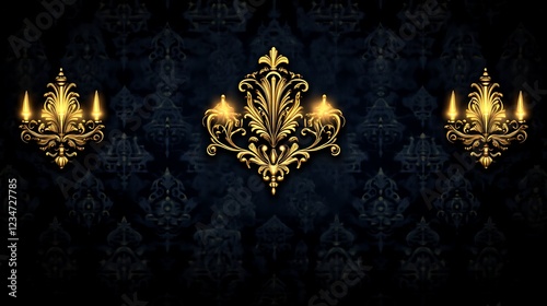 Fototapeta premium Gilded Wall Sconces and Ornate Centerpiece Adorn Dark Wall