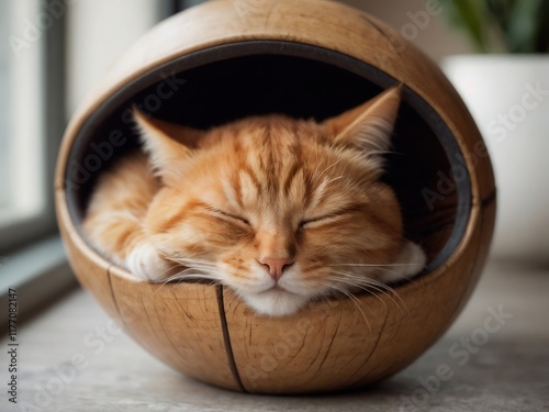 © Vladacha, Naklejka premium Ginger cat naps peacefully inside a wooden bowl, eyes closed