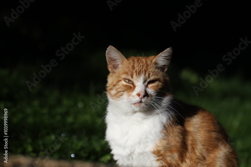© IceFang, Fototapeta premium ginger cat outdoors with green plants garden
