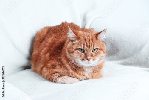 © Julia, Fototapeta premium Ginger cat relaxing on a couch. Pet at home.