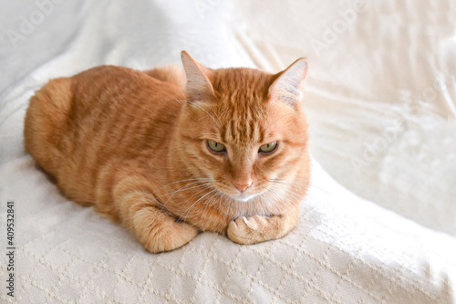 Fototapeta premium Ginger cat sitting on the sofa. Copy space is on the right side.
