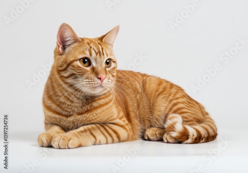 Fototapeta premium Ginger tabby cat lying down on a plain white background looking alert with...