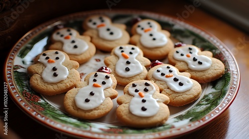 Obraz premium Gingerbread cookies shaped like smiling snowmen arranged on a festive plate