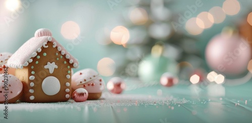 Obraz premium Gingerbread House Surrounded By Colorful Candies On A Mint Green Background