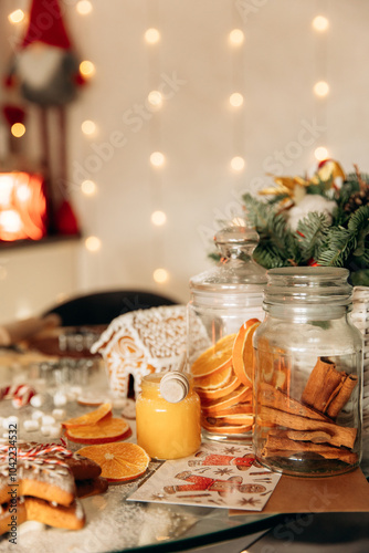 © Alex, Naklejka premium Gingerbread house with glaze, table decoration for Christmas with homemade baking. Christmas tree, citrus, garland basket