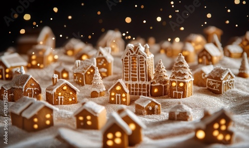 Naklejka premium Gingerbread houses with icing and glowing windows creating a festive holiday...