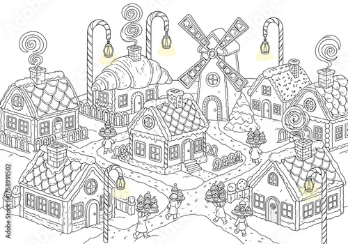 Fototapeta premium Gingerbread village coloring page