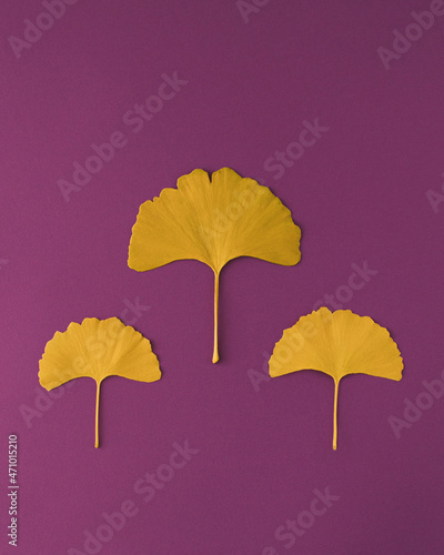 © CocoM7-1, Obraz premium Gingko biloba leaves on violet background. Creative healthy, minimal, natural concept. Flat lay.