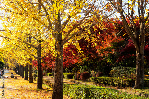 Naklejka premium 人と犬が銀杏並木の下を散歩する風景/Ginkgo and maple trees