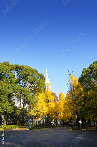 Fototapeta premium Ginkgo tree in front of Meiji Jingu Shrine in autumn season with sunshine blue sky background. Ginkgo tree is a Yellow Ginkgo leaves. tokyo , japan