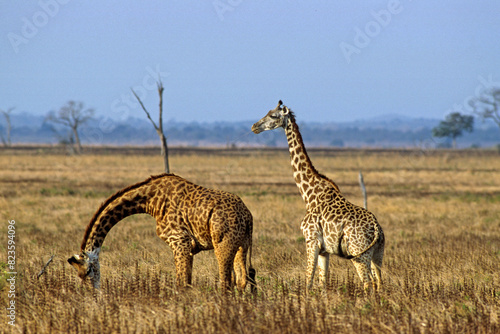 Naklejka premium Girafe masai, Giraffa camelopardalis tippelskirchi , Parc national de Manyara , Tanzanie