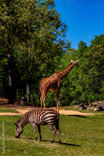 © Timothy, Naklejka premium Giraffe and Zebra at NC Zoo
