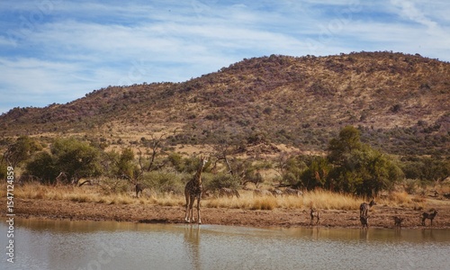 © vectorfusionart, Naklejka premium Giraffe at lakeshore in forest