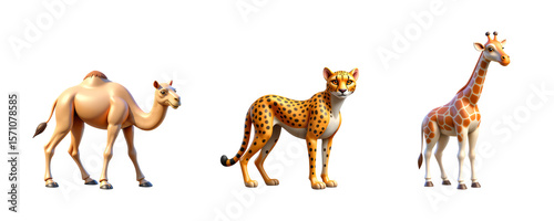 Naklejka premium Giraffe, Cheetah, Camel, icon set, 3D style on transparent background