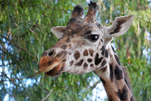 Obraz premium Giraffe Chewing Leaves Close Up