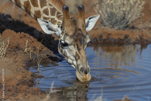 Obraz premium Giraffe drinking water at a watering hole in the African savannah.