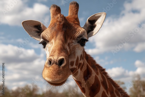 Fototapeta premium Giraffe encounters visitors at safari park, showcasing its distinct features under a bright sky filled with clouds during a sunny afternoon
