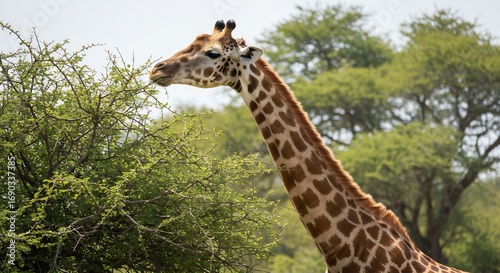 © Lucas, Fototapeta premium Giraffe graast rustig onder zacht ochtendlicht Afrikaanse savanne. AI Generated