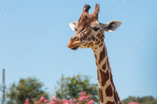 © pablobenii, Naklejka premium Giraffe head with long neck and furry horns on background of blue sky in exotic safari