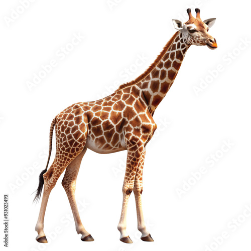 © Joesunt, Fototapeta premium Giraffe in the Spotlight: A majestic giraffe stands tall, its long neck reaching towards the sky, against a crisp white background. The intricate pattern of its coat is highlighted in this stunning ph