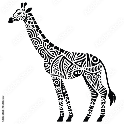 © Cici, Fototapeta premium Giraffe in zentangle art, stencil logo, black and white animal illustration