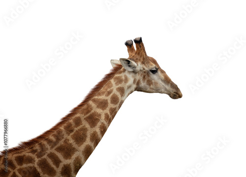 © Rawf8, Fototapeta premium Giraffe isolated on white, transparent. Long neck safari animal at national park in Africa, side view