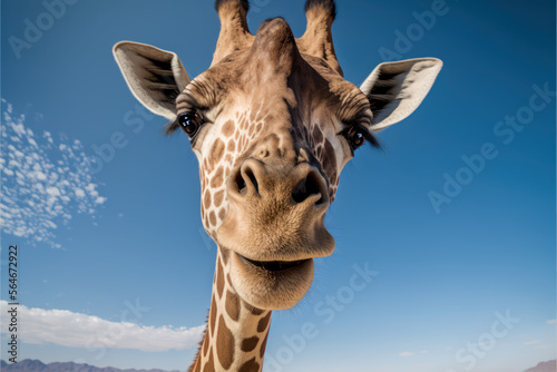 Naklejka premium Giraffe looking straight at camera, against clear blue sky - AI Generated