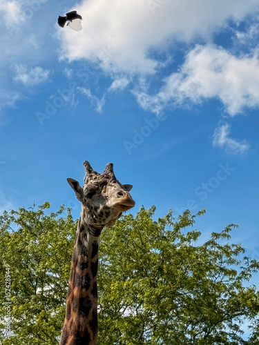 © Rusiaeva.Pgh, Fototapeta premium Giraffe Looking Up as Bird Flies Overhead in Zoo Habitat