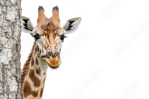 Obraz premium Giraffe peeking from behind a tree, white isolate background