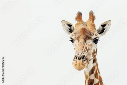 Fototapeta premium Giraffe peeking into the frame from the right on a white background