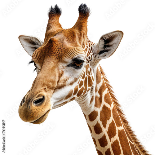 © Jaroot, Fototapeta premium Giraffe portrait; brown & white spots, dark background, neck, horns