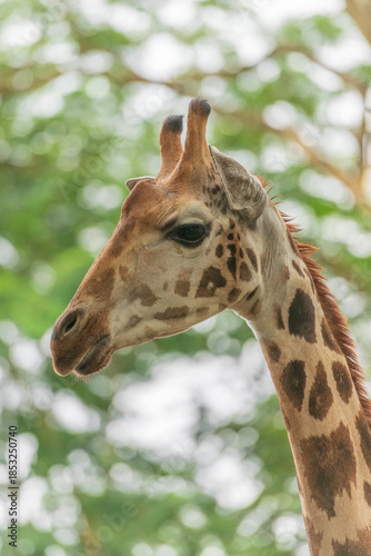 Fototapeta premium Giraffe portrait showing head, eyes and spotted neck with soft green...