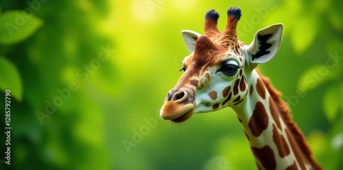 © Duangjai, Obraz premium Giraffe's gentle gaze, soft focus green leaves, spots, serene