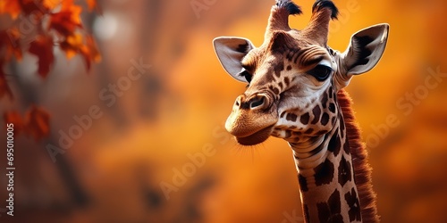 © Omtuanmuda, Obraz premium Giraffe's head rises elegantly against a canvas of autumn leaves.