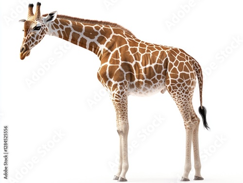 Fototapeta premium Giraffe standing in front of white background, possibly for use in nature documentaries, educational materials or tourism promotions.