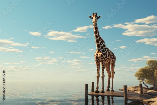 © Saim Art, Obraz premium Giraffe standing ocean side tall legs