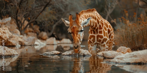 © TheWaterMeloonProjec, Fototapeta premium Giraffe taking a drink from a boulder