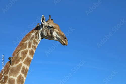 © Ludwig, Fototapeta premium Giraffe und Gelbschnabel-Madenhacker / Giraffe and Yellow-billed oxpecker / Giraffa Camelopardalis et Buphagus africanus