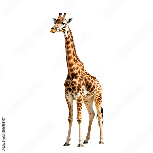© Studicon, Naklejka premium Giraffe with patterned coat standing tall on a white background