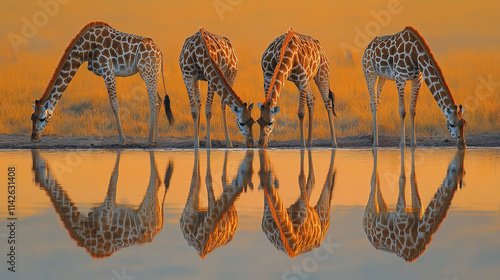 © THUA, Fototapeta premium Giraffes drinking at watering hole with mirrored reflections at sunset