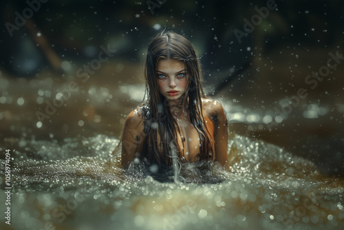 © Dmitriy, Fototapeta premium Girl an amazon warrior standing with spear in river water. background..