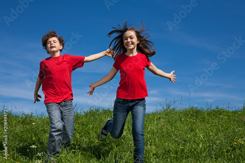 © Jacek Chabraszewski, Fototapeta premium Girl and boy jumping, running outdoor