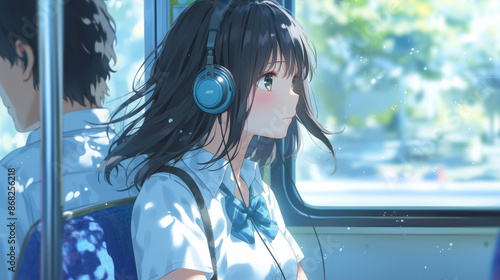 Obraz premium Girl anime listening to music on her headphones. Animation illustration of a young girl on train with her headphones relaxing.