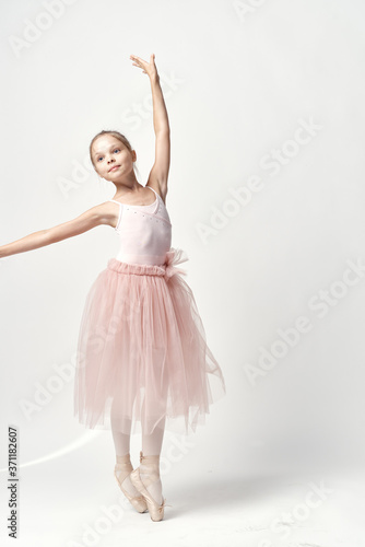 Naklejka premium Girl ballerina in pink dance costume ballet dance pointe shoes tutu light background model