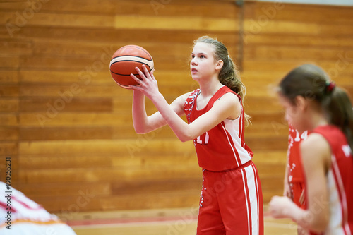© Sergey Ryzhov, Naklejka premium Girl basketball player throws ball in game