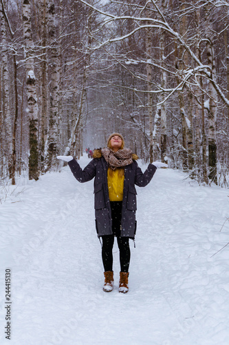 © Evgeny, Naklejka premium girl catches snowflakes in the winter park