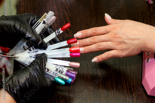 Fototapeta premium girl chooses color of nail polish for manicure in beauty salon using plastic samples